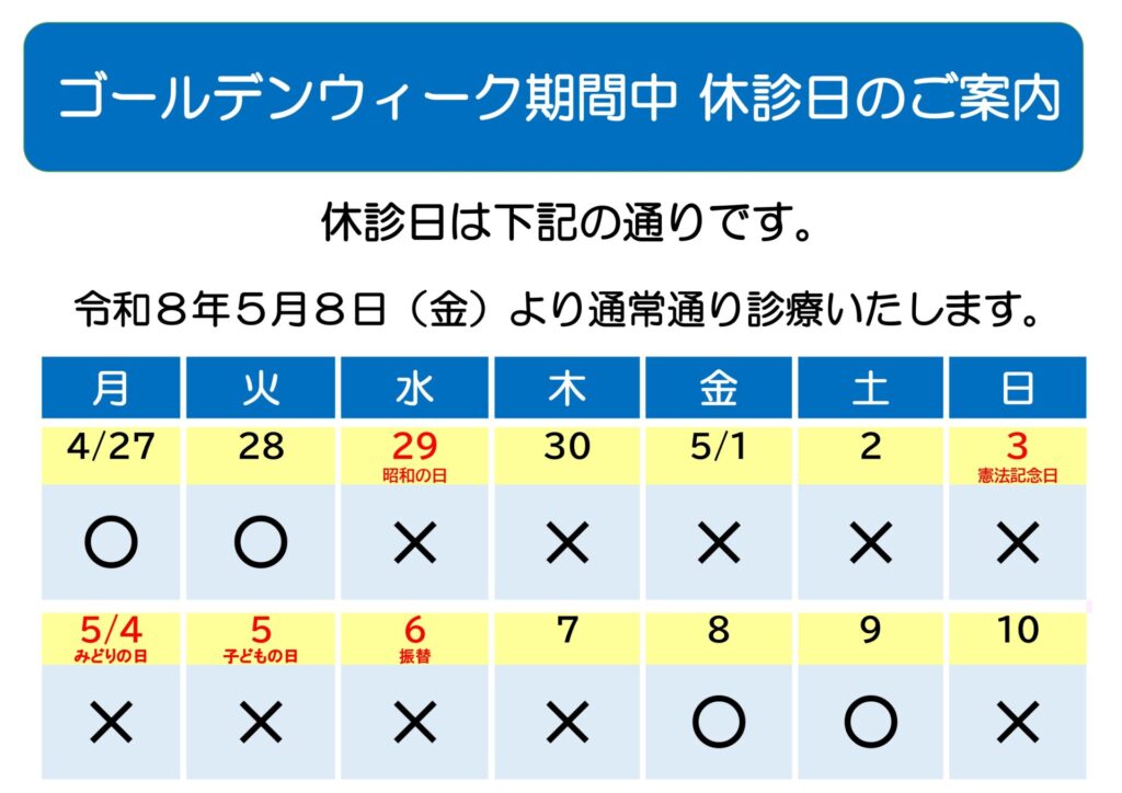 令和8年ゴールデンウィーク期間中休診日のお知らせ